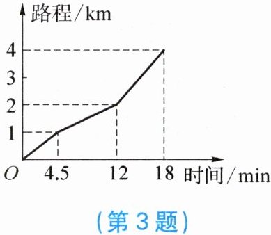 3. 小高从家骑车去单位上班,先走平路到达点A,再走上坡路到达点B,最后走下坡路到达工作单位,所用的时间与路程的关系如图所示.下班后,如果他沿原路返回,且走平路、上坡路、下坡路的速度分别保持和上班时一致,那么他从单位到家需要的时间是(