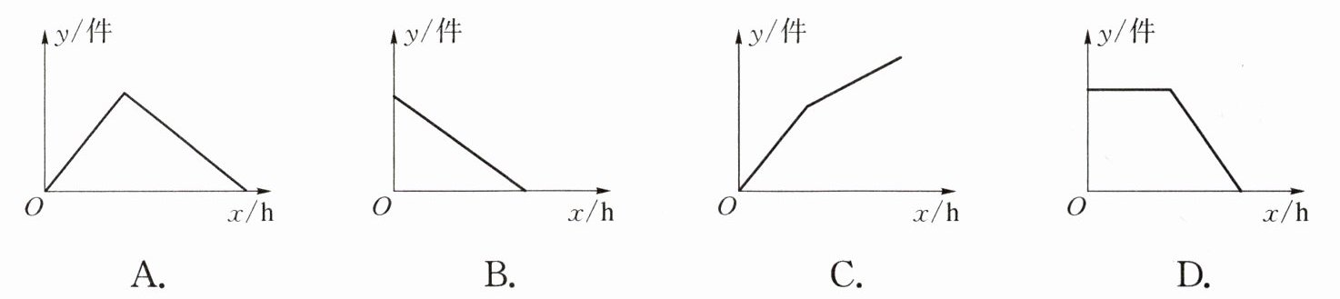 2. 某海产品加工厂的生产流水线的生产速度为100件/h,生产前没有产品积压,生产3h后,同时进行生产和装箱.若装箱速度是150件/h,装箱不影响生产流水线的生产速度,则未装箱的产品数y件是时间x h的函数,这个函数的大致图象可能是(