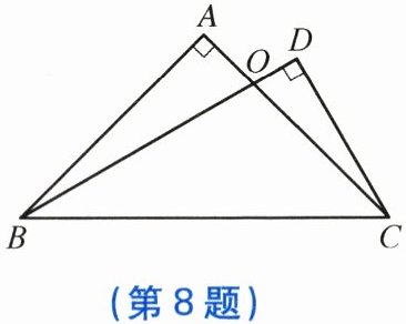 8. 一副三角板($\triangle ABC和\triangle BCD$)如图放置,其中$\angle A = \angle D = 90^{\circ}$,$\angle ABC = 45^{\circ}$,$\angle DBC = 30^{\circ}$,$AC$,$BD交于点O$,则$\angle AOD$的度数为( )。