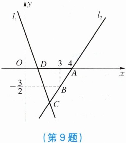 9. 如图,直线 $ l_1: y = -3x + 3 $ 与 $ x $ 轴交于点 $ D $,点 $ A $,$ B $ 的坐标分别为 $ (4,0) $,$ \left(3,-\frac{3}{2}\right) $,直线 $ l_2 $ 经过点 $ A $,$ B $,直线 $ l_1 $,$ l_2 $ 交于点 $ C $。