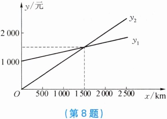 8. 某单位需要用车,准备和个体车主或一家出租车公司签订合同.设汽车每月行驶$x\ km$,应付给个体车主的月租费是$y_1$元,付给出租车公司的月租费是$y_2$元,$y_1$,$y_2分别与x$之间的函数关系图象是如图所示的两条射线,观察图象,回答下列问题: