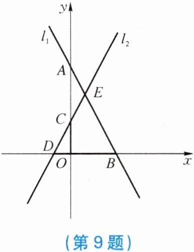 9. 如图,在平面直角坐标系中,直线$l_1$:$y = -2x + 6与坐标轴交于A$,$B$两点,直线$l_2$:$y = kx + 2(k > 0)与坐标轴交于点C$,$D$,直线$l_1$,$l_2交于点E$.