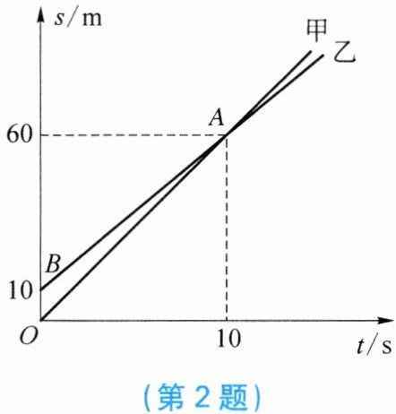 2. 如图,$ OA $ 和 $ BA $ 分别表示甲、乙两名学生跑步的路程与时间的一次函数的图象,图中 $ s $ 和 $ t $ 分别表示路程(单位:$ m $)和时间(单位:$ s $),根据图象,若甲、乙两人同时跑 $ 210m $,快者比慢者少用(