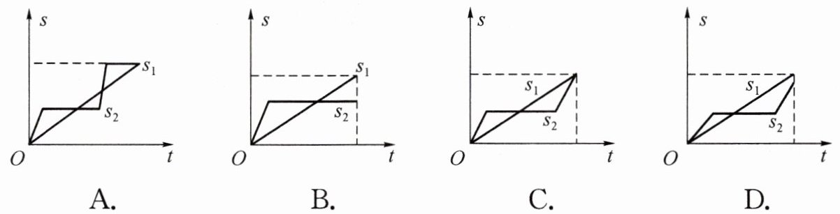 3. “龟兔赛跑”讲述了这样的故事:领先的兔子看着缓慢的乌龟,骄傲起来,睡了一觉,当它醒来时,发现乌龟快到终点了,于是急忙追赶,但为时已晚,乌龟还是先到达了终点.用 $ s_1,s_2 $ 分别表示乌龟和兔子所行路程,$ t $ 表示时间,则下列图象中与故事情节相吻合的是(
