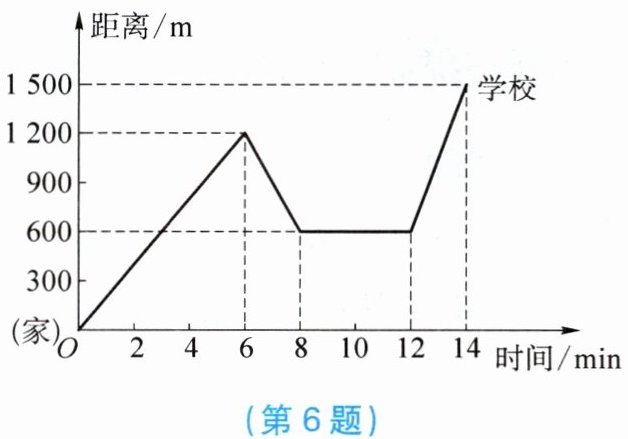 6. 小明骑单车上学,当他骑了一段路时,想起要买某本书,买到书后继续去学校.他本次上学所用的时间与离家距离的关系如图所示.根据图中提供的信息,回答下列问题: