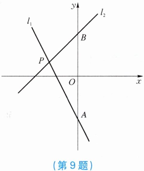 9. 如图,已知直线 $ l_1: y_1 = -2x - 3 $,直线 $ l_2: y_2 = x + 3 $,直线 $ l_1 $ 与 $ l_2 $ 交于点 $ P $,直线 $ l_1 $,$ l_2 $ 分别与 $ y $ 轴交于点 $ A $,$ B $。