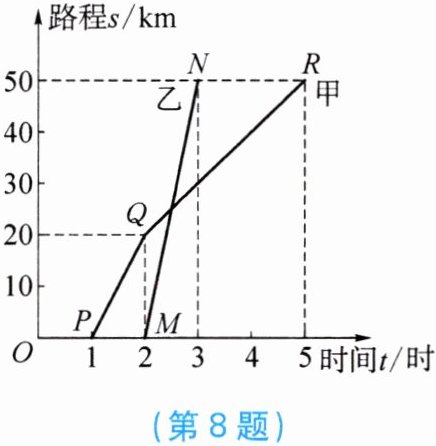 8. $ A $,$ B $ 两地相距 $ 50 \, km $,下午 1 时甲骑自行车从 $ A $ 地出发去 $ B $ 地,乙也在同日下午骑摩托车从 $ A $ 地去 $ B $ 地。图中折线 $ PQR $ 和线段 $ MN $ 分别代表甲和乙所行驶的路程 $ s \, km $ 与该日下午时间 $ t $ 时之间的关系。
