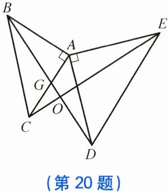 20. 如图,$\triangle ABC和\triangle ADE$都是等腰直角三角形,$\angle BAC = \angle DAE = 90^{\circ}$,$CE与BD相交于点O$,$BD交AC于点G$。求证: