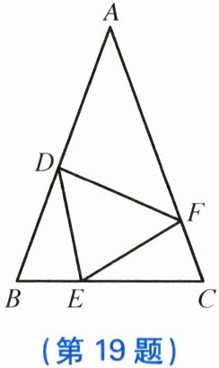 19. 如图,在$\triangle ABC$中,$AB = AC$,点$D$,$E$,$F分别在边AB$,$BC$,$AC$上,且$BE = CF$,$BD = CE$。