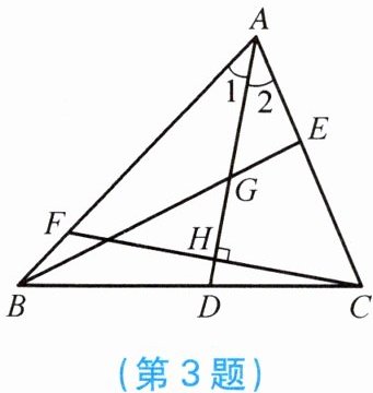 3. 如图,在$\triangle ABC$中,$\angle 1= \angle 2$,点$D在边BC$上,$G为AD$的中点,延长$BG交AC于点E$,$F为AB$上一点,$CF\perp AD于点H$,下列判断正确的是(