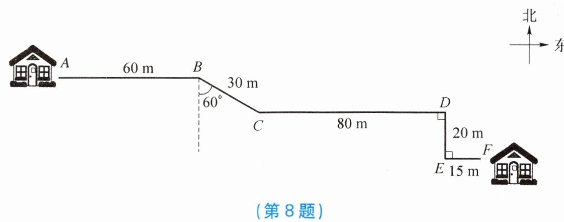 从A地出发,向正东方向行走60 m到达B地,再从B地沿南偏东60°方向行走30 m到达C地,再从C地向正东方向行走80 m到达D地,再从D地沿正南方向行走20 m到达E地,再从E地沿正东方向行走15 m到达F地
