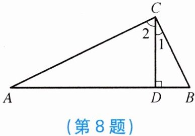 8. 如图,在 $ \triangle ABC $ 中, $ \angle ACB = 90^{\circ} $, $ CD \perp AB $ 于点 $ D $, $ \angle 1 $ 与 $ \angle A $, $ \angle 2 $ 与 $ \angle B $ 有什么关系? 用一个命题表达你所得到的结论.