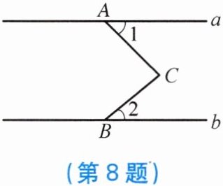 8. 如图,直线$a// b$,点$A在直线a$上,点$B在直线b$上,点$C在直线a$,$b$间。试用两种不同的方法证明$\angle ACB = \angle 1 + \angle 2$。