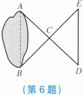 6. 如图,$ A $,$ B $ 两点分别位于一个假山的两端,小明想测量 $ A $,$ B $ 间的距离,首先在地面上取一个可以直接到达点 $ A $,$ B $ 的点 $ C $,连接 $ AC $ 并延长到点 $ D $,使 $ CD = AC $,连接 $ BC $ 并延长到点 $ E $,使 $ CE = CB $,连接 $ DE $ 并测量出它的长度为 $ 8m $,则点 $ A $,$ B $ 间的距离为