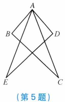 5. 如图,小飞设计的“风筝”图案由$\triangle ABC和\triangle ADE$构成。已知$BC = DE$,$\angle B= \angle D$,$\angle BAC= \angle DAE$,那么$AC = AE$。小飞用已知条件直接证明了$\triangle ABC\cong\triangle ADE$,他证明两三角形全等的依据是