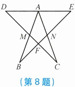 8. 如图,点$D$,$A$,$E$在同一条直线上,$\triangle ADC \cong \triangle AEB$,$DC$,$BE交于点F$,$\angle BAC = 40^{\circ}$,$\angle D = 45^{\circ}$,$DC交AB于点M$,$BE交AC于点N$.求: