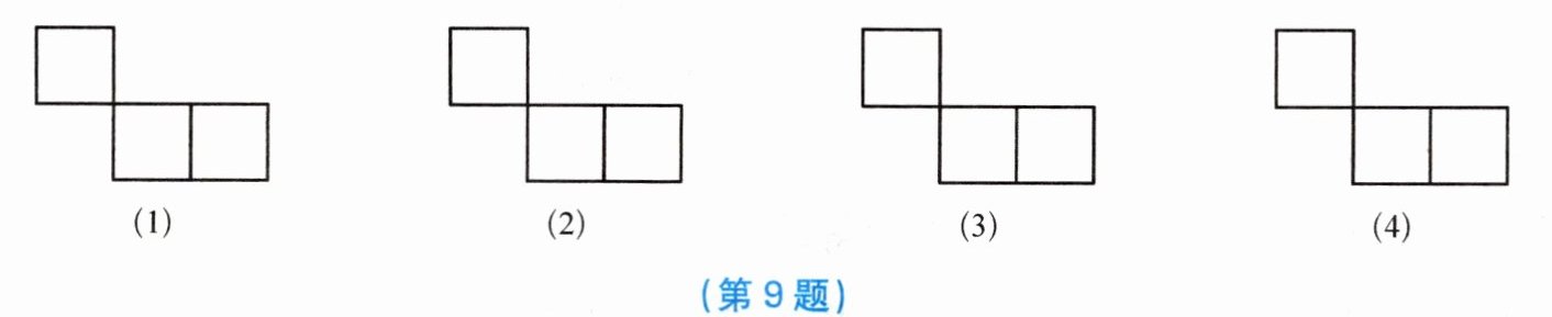9. 由三个小正方形组成的图形如图所示,再给你一个同样的小正方形,请你将它拼接在原图形上,使新图形变成一个轴对称图形.请你分别画出$4$种不同的拼接方案,并画出对称轴.