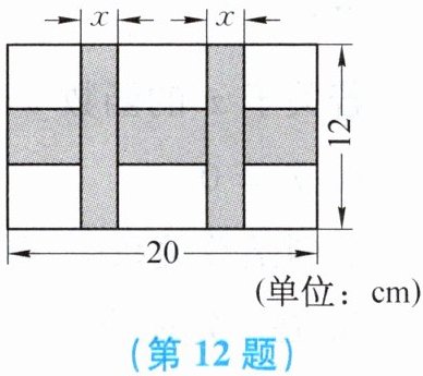 12. 下图是一幅长 20 cm、宽 12 cm 的图案,其中有一横两竖的条形图案,横、竖条的宽度比为 $ 3:2 $.设竖条的宽度为 $ x $ cm,三个条形图案所占面积为 $ y $ $ cm^{2} $.求 $ y $ 与 $ x $ 之间的函数表达式,并求出自变量 $ x $ 的取值范围.