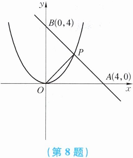 8. 如图,直线 $ l $ 经过点 $ A(4, 0) $ 和 $ B(0, 4) $,它与抛物线 $ y = ax^{2} $ 在第一象限内交于点 $ P $,$ \triangle AOP $ 的面积为 $ \dfrac{9}{2} $. 求 $ a $ 的值.
