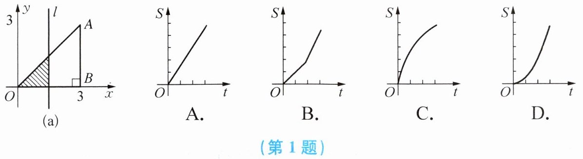 1. 如图(a)所示,直角三角形 $ AOB $ 中,$ AB \perp OB $,且 $ AB = OB = 3 $。设直线 $ l: x = t $ 截此三角形所得的阴影部分的面积为 $ S $,则 $ S $ 与 $ t $ 之间的函数关系的图象为(