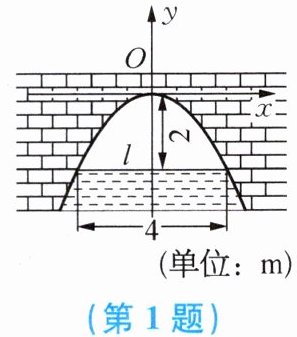 1. 下图是一个横断面为抛物线形状的拱桥.当水面在 $ l $ 时,拱顶(拱桥洞的最高点)离水面 $ 2 \mathrm{~m} $,水面宽 $ 4 \mathrm{~m} $.如图建立平面直角坐标系,则抛物线的函数表达式是(