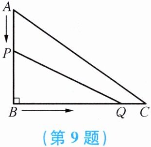 9. 如图,在 $ \triangle ABC $ 中,$ \angle ABC = 90^{\circ} $,$ AB = 6 \, cm $,$ BC = 8 \, cm $,点 $ P $ 从点 $ A $ 开始沿边 $ AB $ 向点 $ B $ 以 $ 1 \, cm/s $ 的速度移动,点 $ Q $ 从点 $ B $ 开始沿边 $ BC $ 向点 $ C $ 以 $ 2 \, cm/s $ 的速度移动。如果 $ P $,$ Q $ 分别从 $ A $,$ B $ 同时出发,$ t \, s $ 时,$ \triangle PBQ $ 的面积为 $ y \, cm^2 $。
