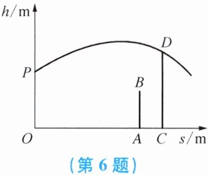 6. 甲、乙两人进行羽毛球比赛,甲发出一颗十分关键的球,出手点为 $ P $,羽毛球发出后距地面高度 $ h $ m 与羽毛球飞出的水平距离 $ s $ m 之间的关系为 $ h = -\frac{1}{12}s^{2} + \frac{2}{3}s + \frac{3}{2} $.如图,已知球网 $ AB $ 距原点 5 m,乙扣球的最大高度(用线段 $ CD $ 表示)为 $ \frac{9}{4} $ m,设乙的起跳点 $ C $ 的横坐标为 $ m $.若乙原地起跳,因球的高度高于乙扣球的最大高度而导致接球失败,则 $ m $ 的取值范围是______