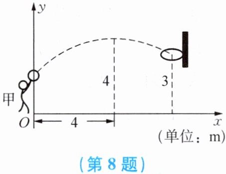 8. 如图,某校九年级的一场篮球比赛中,队员甲正在投篮.已知球出手时离地面高 $ \frac{20}{9} $ m,与篮圈中心的水平距离为 7 m,当球出手后水平运动 4 m 时达到最大高度 4 m.设篮球运动的轨迹为抛物线,篮圈距地面 3 m.