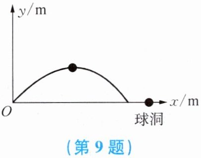 9. 如图,王强在一次高尔夫球的练习中,在某处击球,球的飞行路线满足抛物线 $ y = -\frac{1}{5}x^{2} + \frac{8}{5}x $,其中 $ y $ m 是球的飞行高度,$ x $ m 是球飞出的水平距离,结果球离球洞的水平距离还有 2 m.