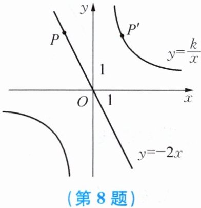 8. 如图,已知直线$y = - 2x经过点P(-2,a)$,点$P关于y轴的对称点P'在反比例函数y= \frac{k}{x}(k\neq0)$的图象上.