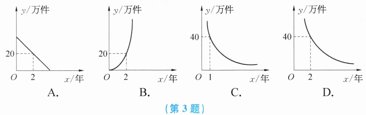 3. 一台机器每年可生产的产品数量$y万件与它的使用时间x$年成反比例关系,当$x = 2$时,$y = 20$.则$y与x$之间的函数图象大致是(