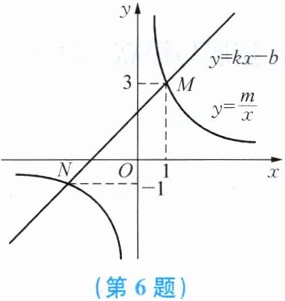 6. 如图,反比例函数 $ y = \frac{m}{x} $ 的图象与一次函数 $ y = kx - b $ 的图象交于点 $ M $,$ N $.已知点 $ M $ 的坐标为 $ (1, 3) $,点 $ N $ 的纵坐标为 $ -1 $.根据图象信息可得关于 $ x $ 的方程 $ \frac{m}{x} = kx - b $ 的解为