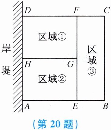 20. 为了节省材料,某水产养殖户利用水库的岸堤(岸堤足够长)为一边,用总长为 $ 80 m $ 的围网在水库中围成了如图所示的①②③三块矩形区域,而且这三块矩形区域的面积相等.设 $ BC $ 的长度是 $ x m $,矩形区域 $ ABCD $ 的面积为 $ y m^2 $.