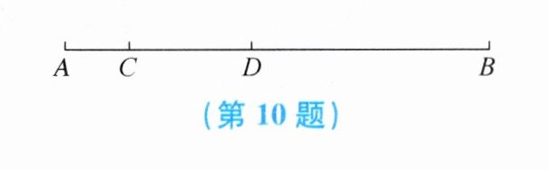 10. 如图,点 $ C $,$ D $ 在线段 $ AB $ 上,且 $ AC = 1cm $,$ CD = 2cm $,$ DB = 4cm $。