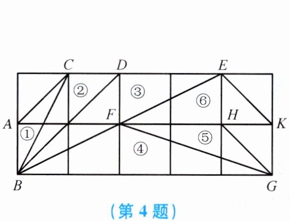4. 如图,在正方形网格上有$6$个斜三角形:①$\triangle ABC$,②$\triangle CDB$,③$\triangle DEB$,④$\triangle FBG$,⑤$\triangle HGF$,⑥$\triangle EKF$。在②~⑥中,与①相似的三角形的序号是