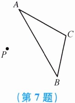 7. 如图,以点 $P$ 为位似中心画 $\triangle ABC$ 的位似图形 $\triangle DEF$,使 $\triangle ABC$ 与 $\triangle DEF$ 的位似比为 $1:2$,并写出 $\triangle ABC$ 与 $\triangle DEF$ 的面积比和周长比。