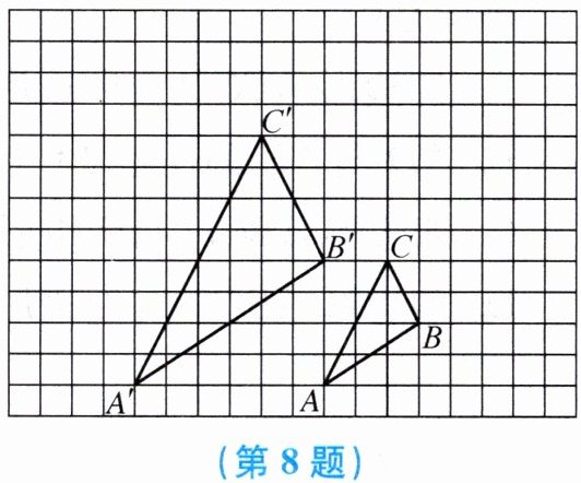 8. 如图,图中的小方格都是边长为 $1$ 的正方形,$\triangle ABC$ 与 $\triangle A'B'C'$ 是以点 $O$ 为位似中心的位似图形,它们的顶点都在小正方形的顶点上。
