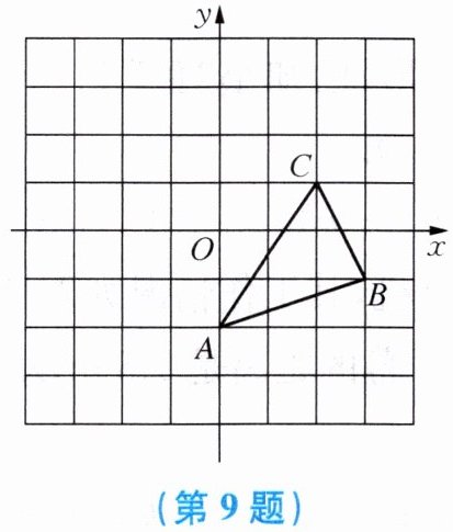 9. 如图,点 $A$,$B$,$C$ 的坐标分别为 $(0,-2)$,$(3,-1)$,$(2,1)$,以点 $B$ 为位似中心,将 $\triangle ABC$ 放大到 $2$ 倍,按要求画出变换后的图形,并求点 $C$ 的对应点 $C'$ 的坐标。