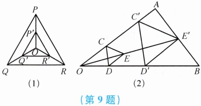 9. (1) 如图 (1),点 $O$ 是等边三角形 $PQR$ 的中心,$P'$,$Q'$,$R'$ 分别是 $OP$,$OQ$,$OR$ 的中点,则 $\triangle P'Q'R'$ 与 $\triangle PQR$ 是位似三角形,此时,$\triangle P'Q'R'$ 与 $\triangle PQR$ 的相似比、位似中心分别为