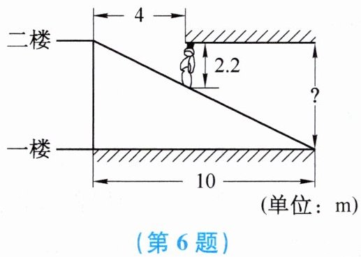 6. 如图,某超市在一楼至二楼之间安装有电梯,天花板与地面平行.张强扛着箱子(人与箱子的总高度约为$2.2\ m$)乘电梯刚好安全通过.请你根据图中数据回答,两层楼之间的高约为(