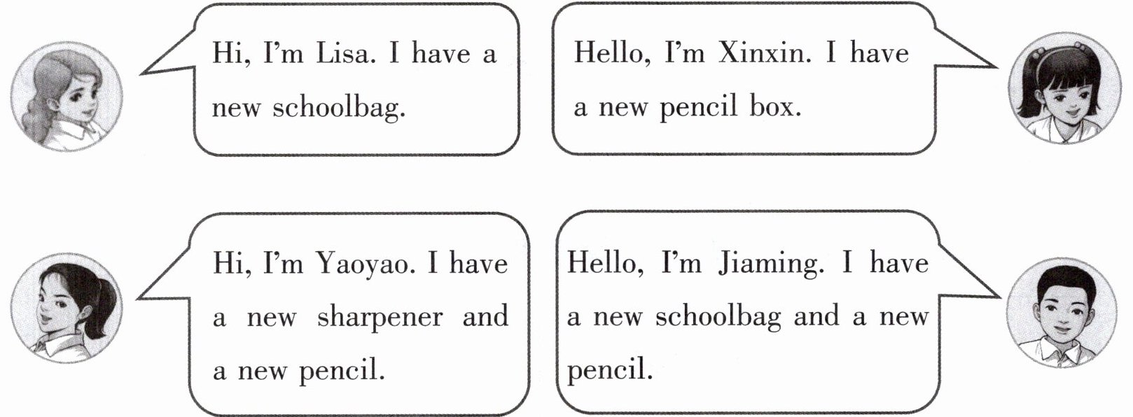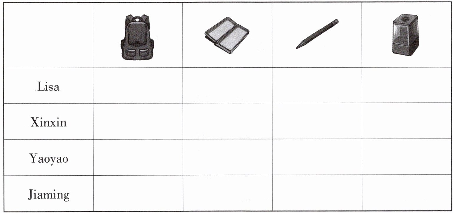Lisa—书包,Xinxin—铅笔盒,Yaoyao—转笔刀,铅笔,Jiaming—书包,铅笔