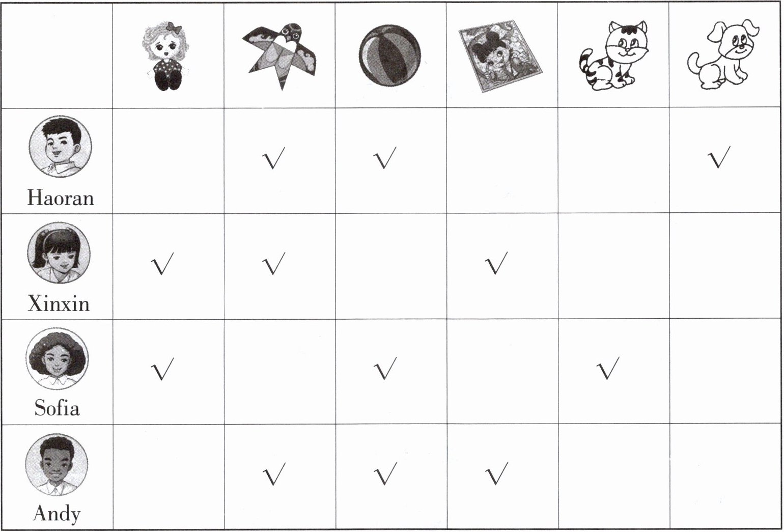 )3. I'm Sofia. I have a doll, a ball and a kite.(