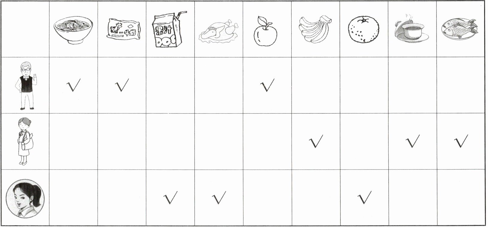 妈妈:A, I, G 爸爸:F, H, B Yaoyao:E, C, D [注意:此题按照第二句的“drinks, fruits and dishes”的顺序填写]