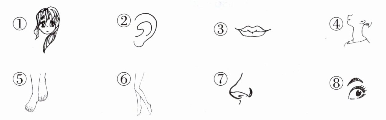 head(①) neck(④) legs(⑥) feet(⑤) ear(②) mouth(③) eye(⑧) nose(⑦)