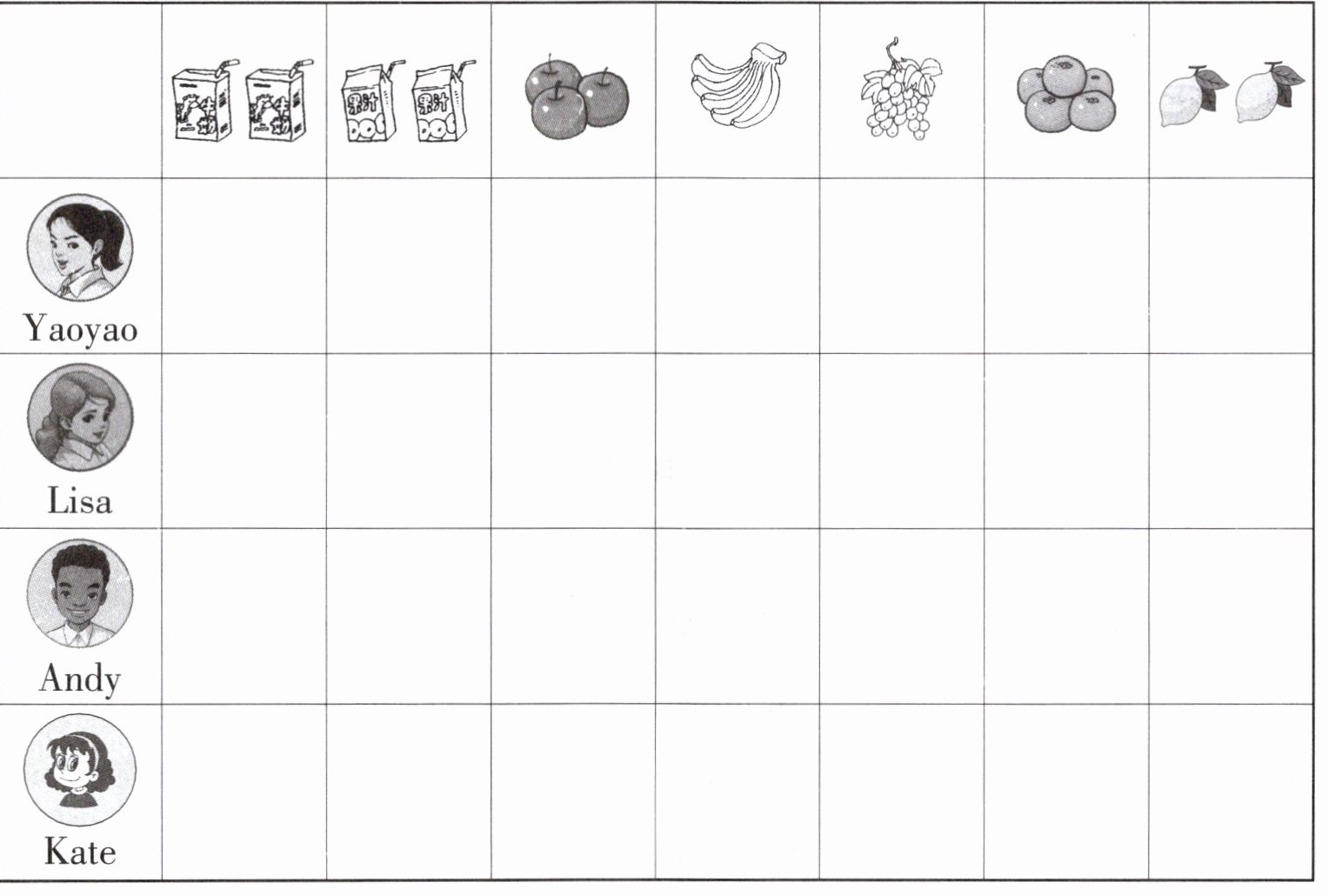 Yaoyao:苹果,香蕉 Lisa:牛奶,果汁,橘子 Andy:牛奶,香蕉,葡萄 Kate:果汁,香蕉,柠檬