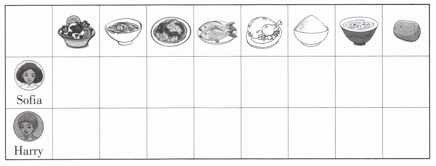 二、Look, listen and tick. 听录音,在 Sofia 和 Harry 想要吃的食物格内画“√”。
