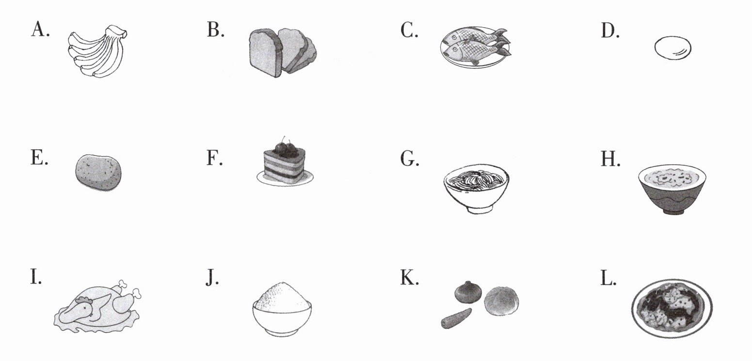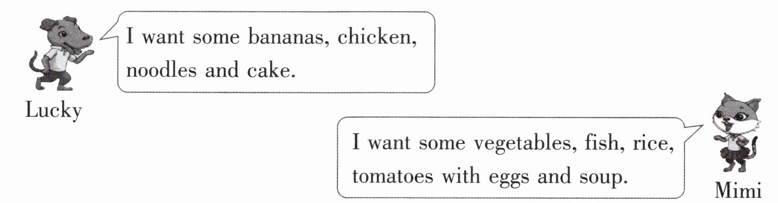四、根据图片和问题提示,将 Lucky 和 Mimi 想吃的食物序号填在横线上。