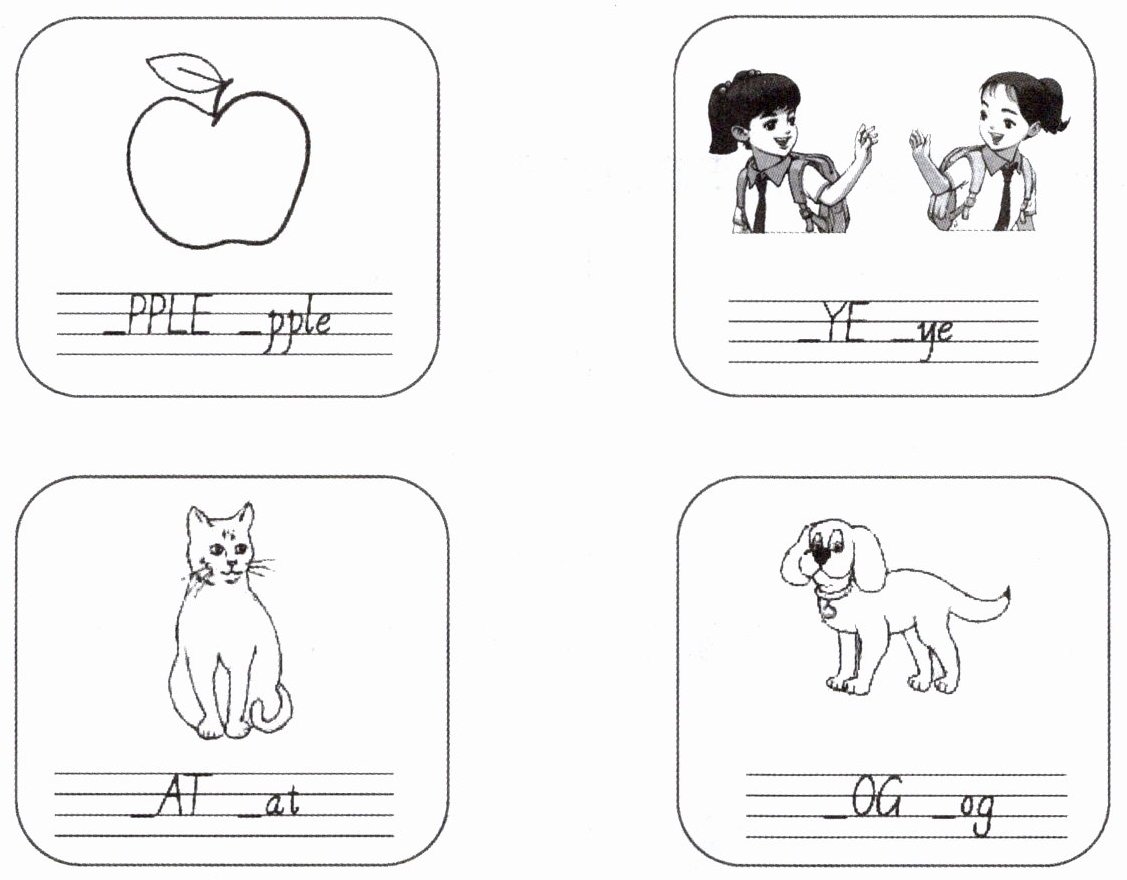 四、将图片涂上自己喜欢的颜色,并将单词补充完整。