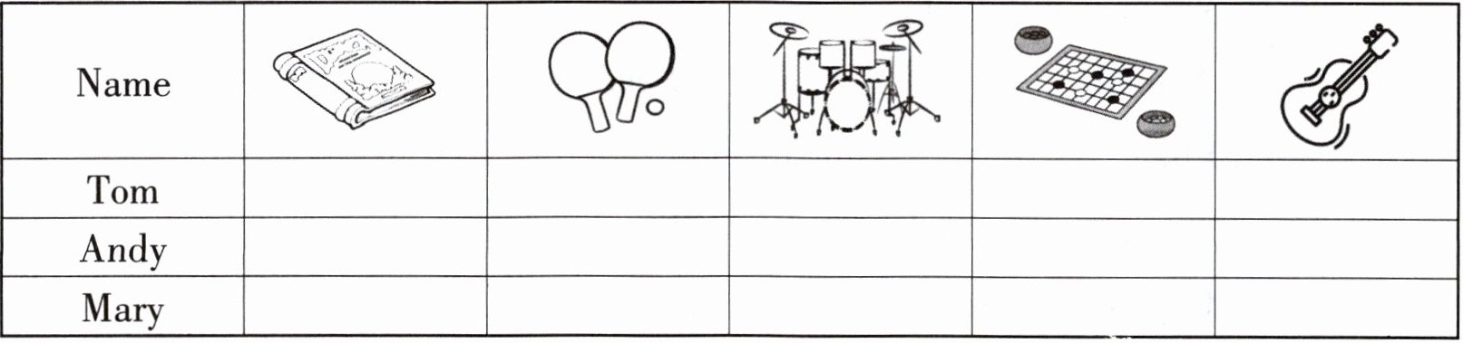 My friends have different hobbies. Tom likes playing the drums. He also plays the guitar well. He loves music. Andy is a quiet boy. He likes playing *weiqi* and reading stories. He reads stories every day. Mary is good at playing ping - pong. She often plays ping - pong on weekends. Mary enjoys reading stories, too. She often reads stories with Andy.