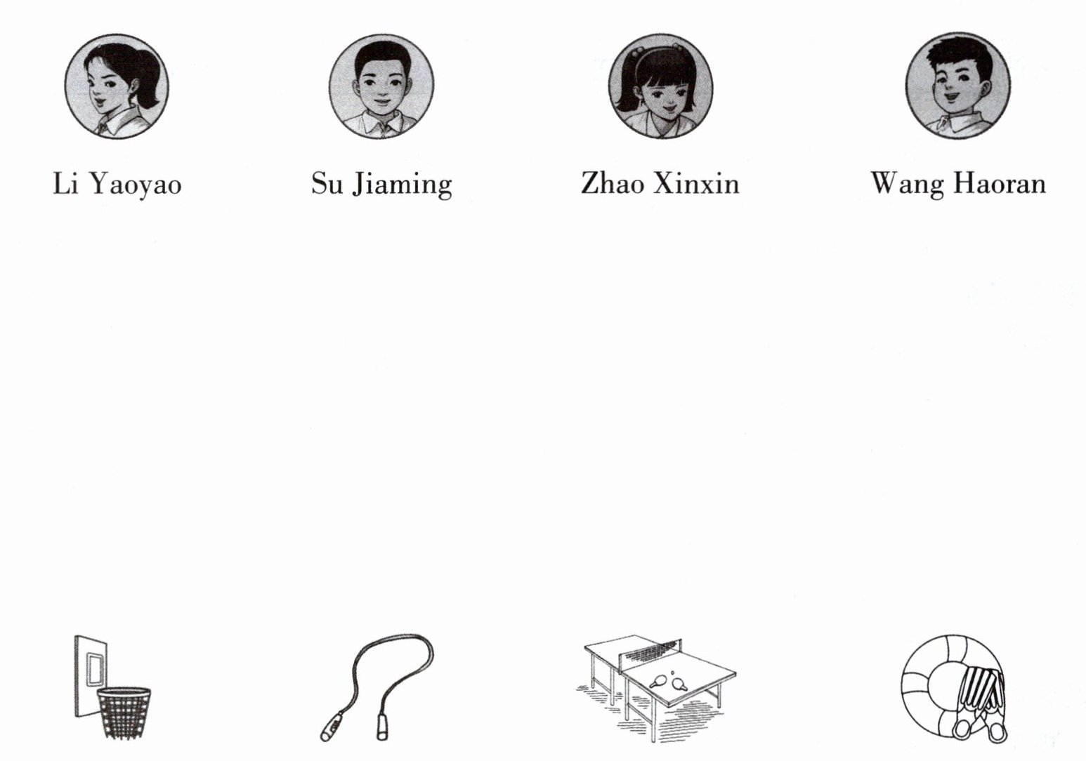 一、Look, listen and match. 看图,听录音,将人物与他们喜爱的运动项目连线。